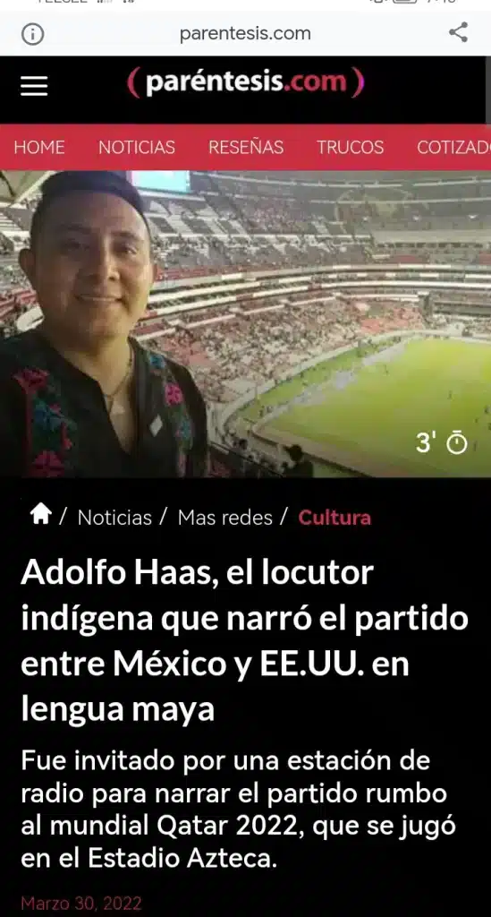 En marzo del 2022, me convertí en el primer indígena maya en narrar dos partidos de la selección mexicana en el Estadio Azteca, orgullosamente lo hice en maya.